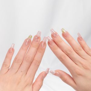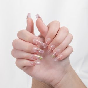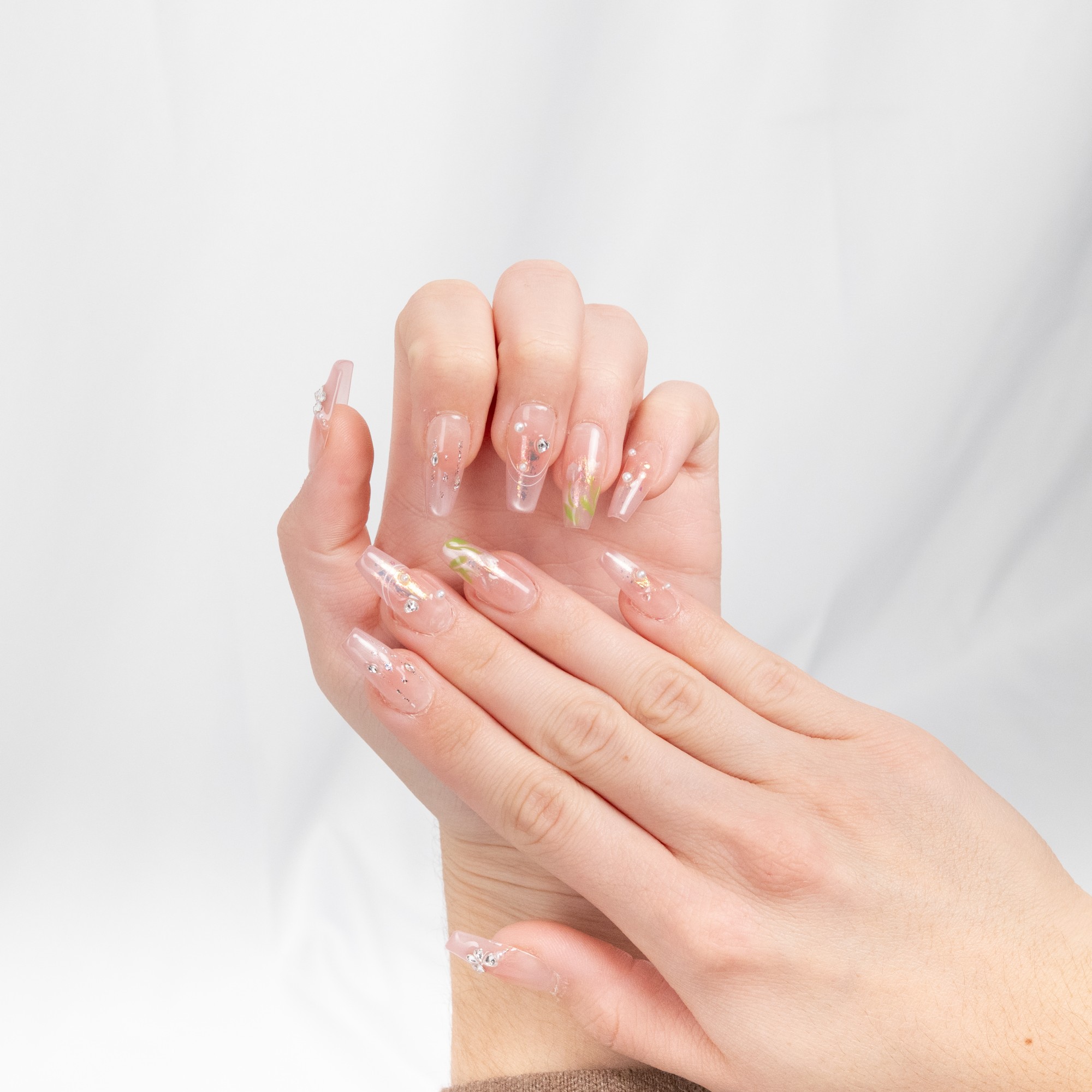 Rosa suave con flores pintadas a mano y detalles brillantes, evocando la delicadeza de la primavera.