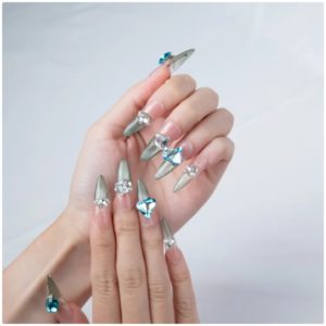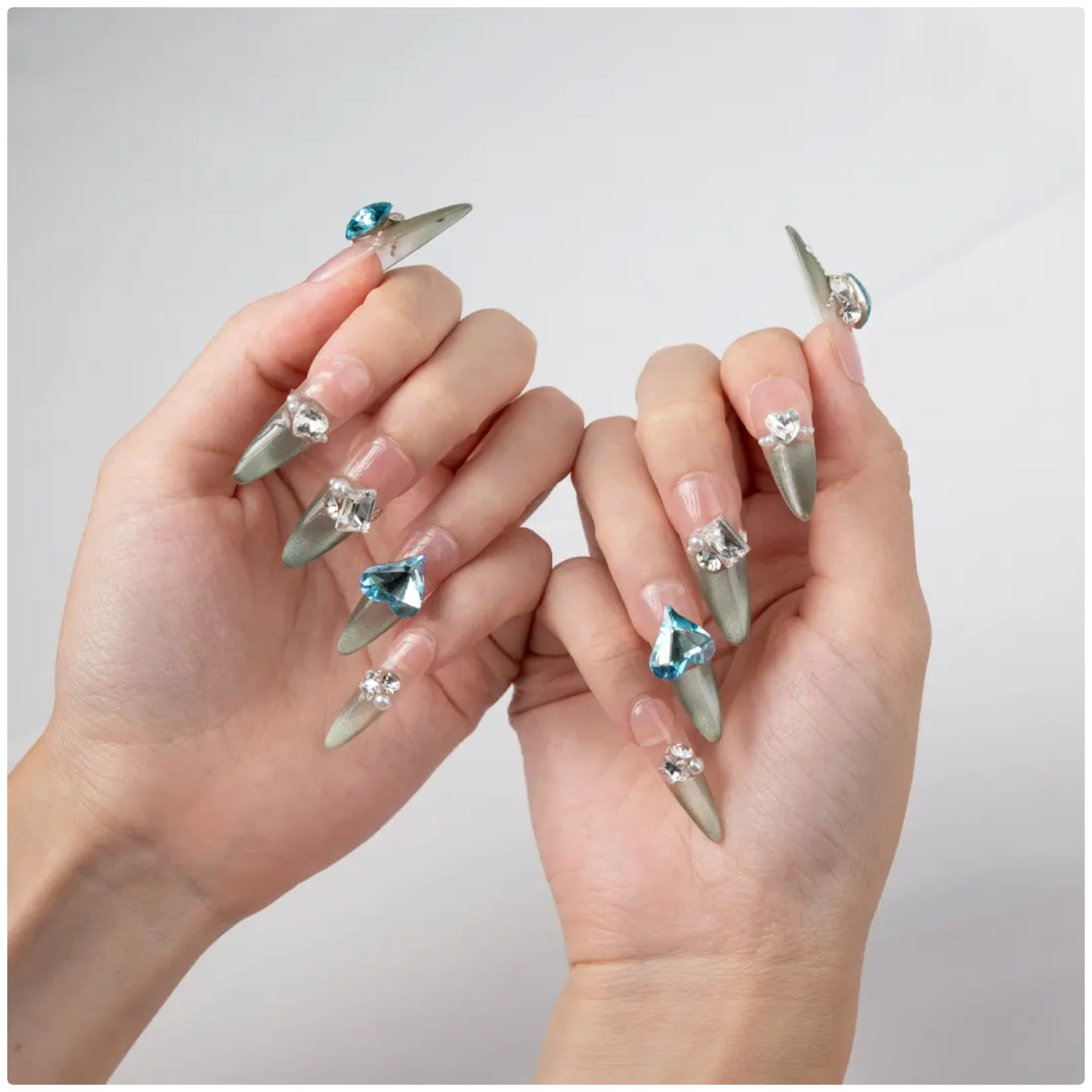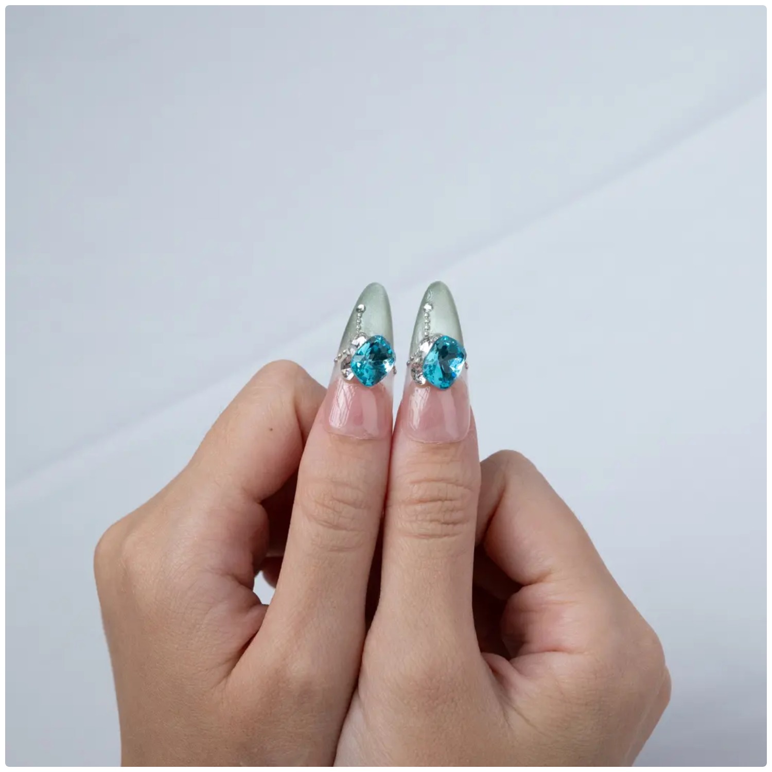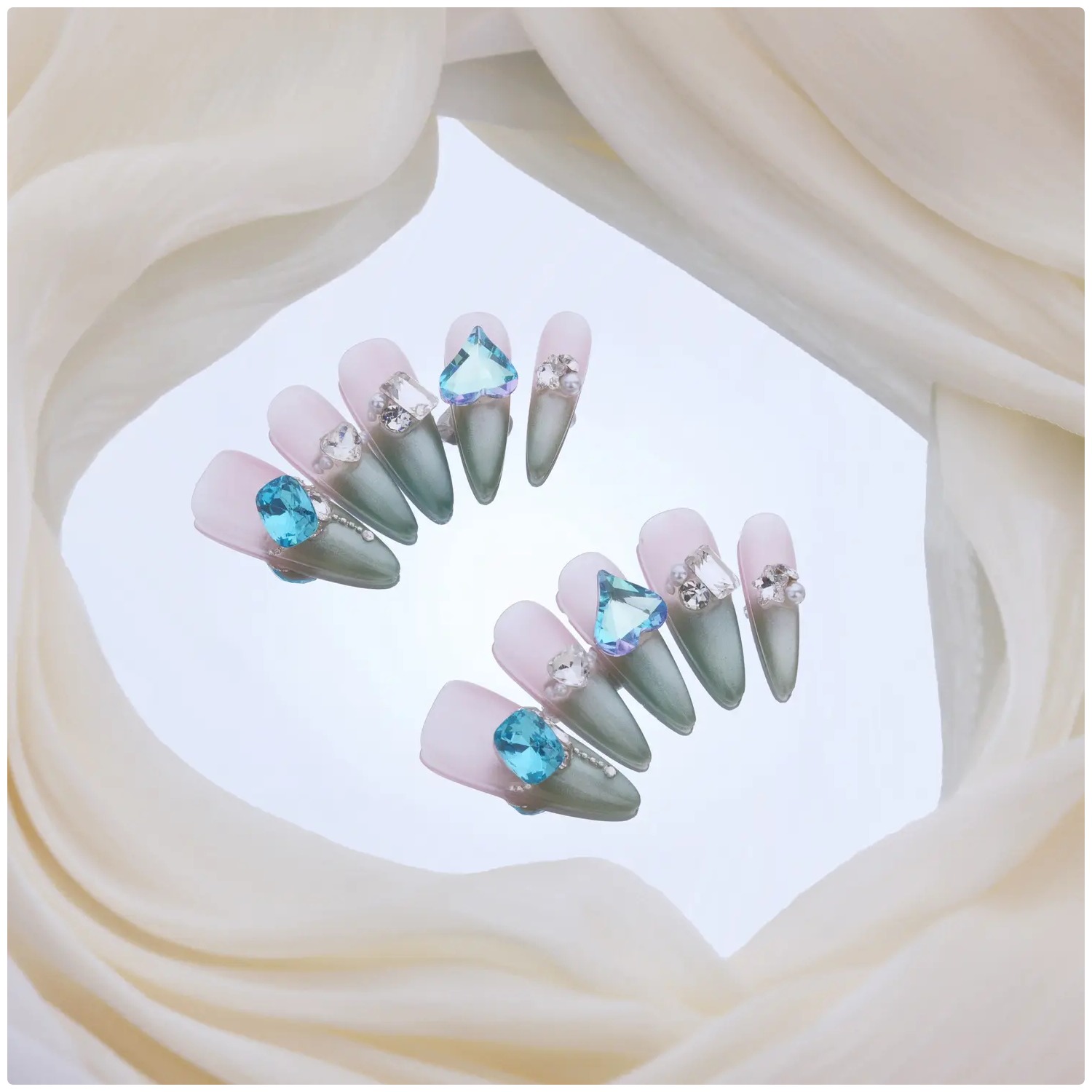 Nude con degradado verde y grandes piedras azules, un estilo llamativo y vibrante.