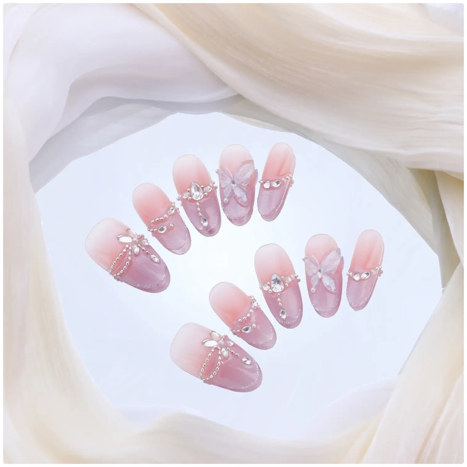 Rosa degradado con mariposas y gemas brillantes, delicado y romántico.