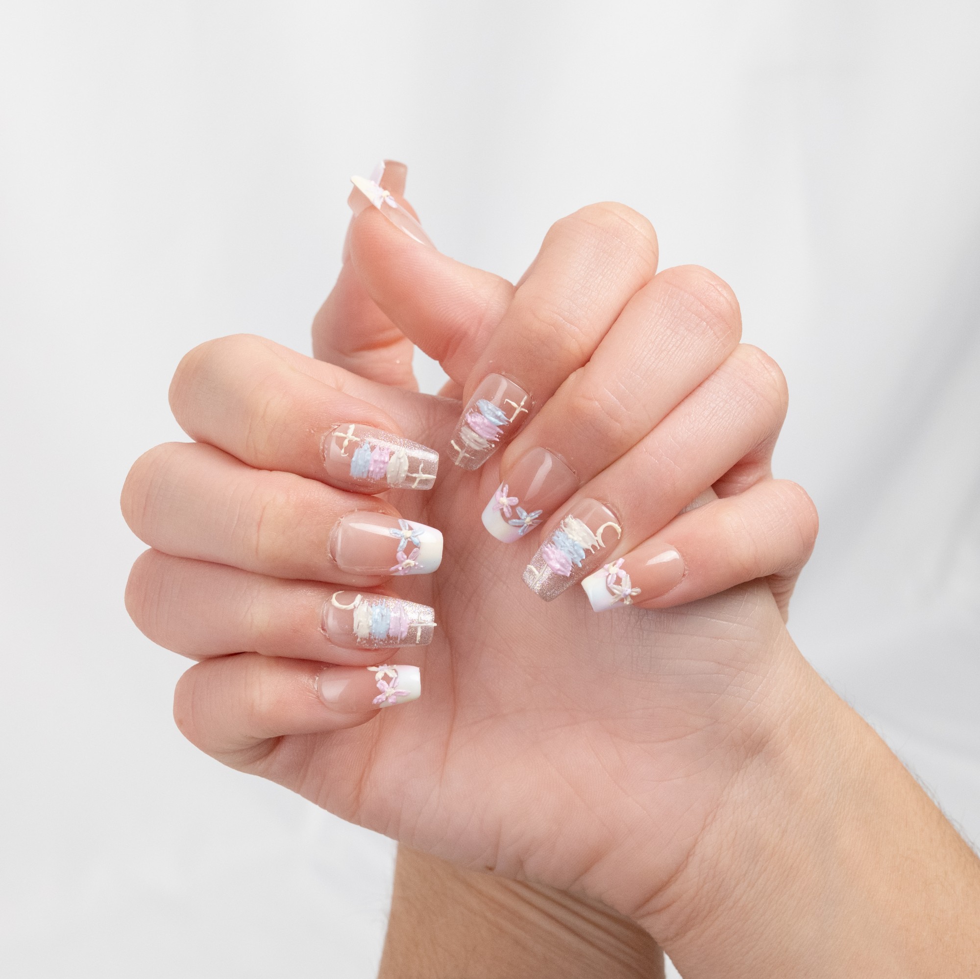 Tonos pastel con texturas que recuerdan nubes de algodón y flores coloridas, dulces y soñadoras.