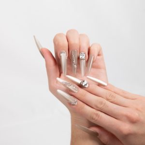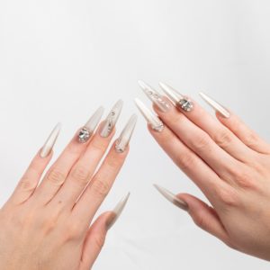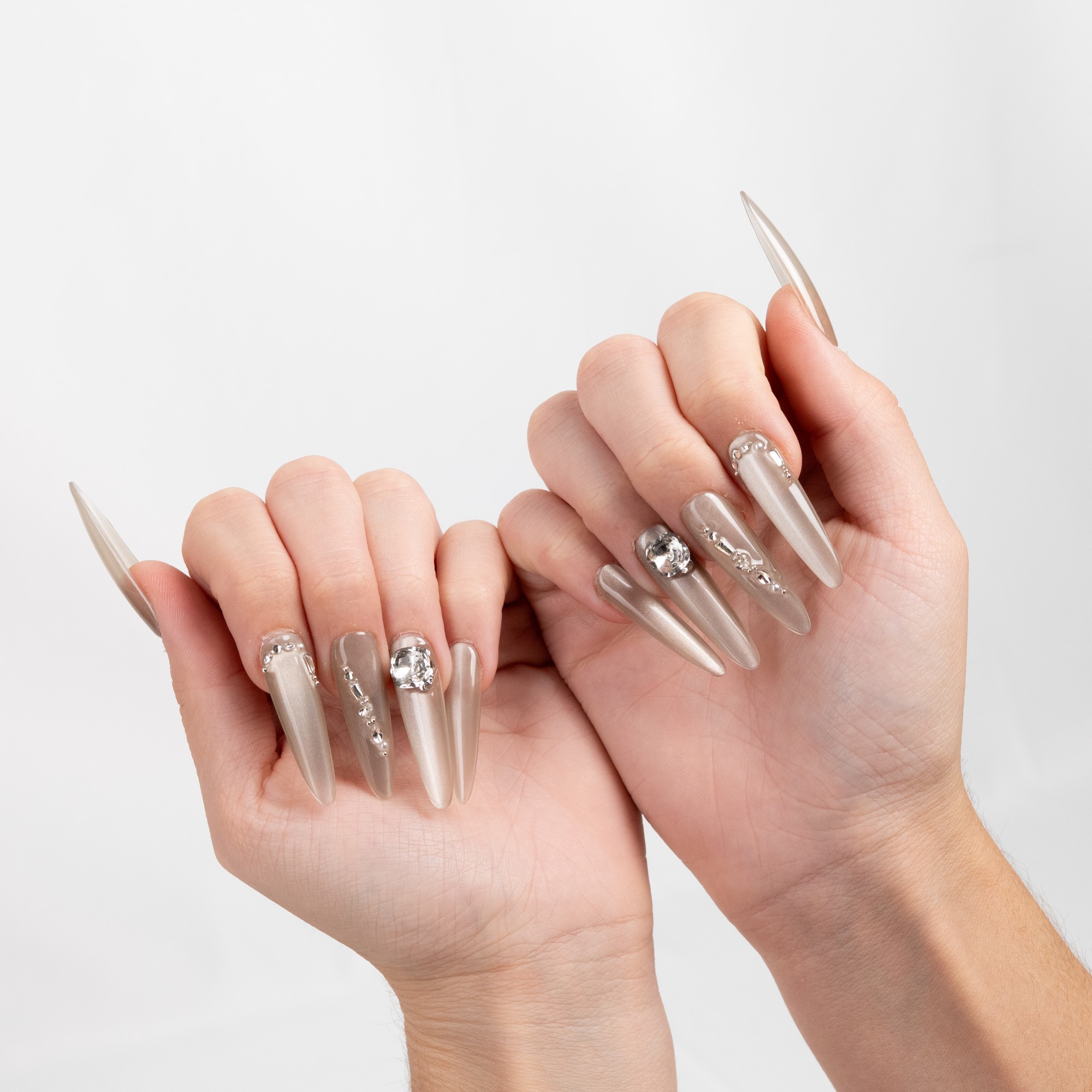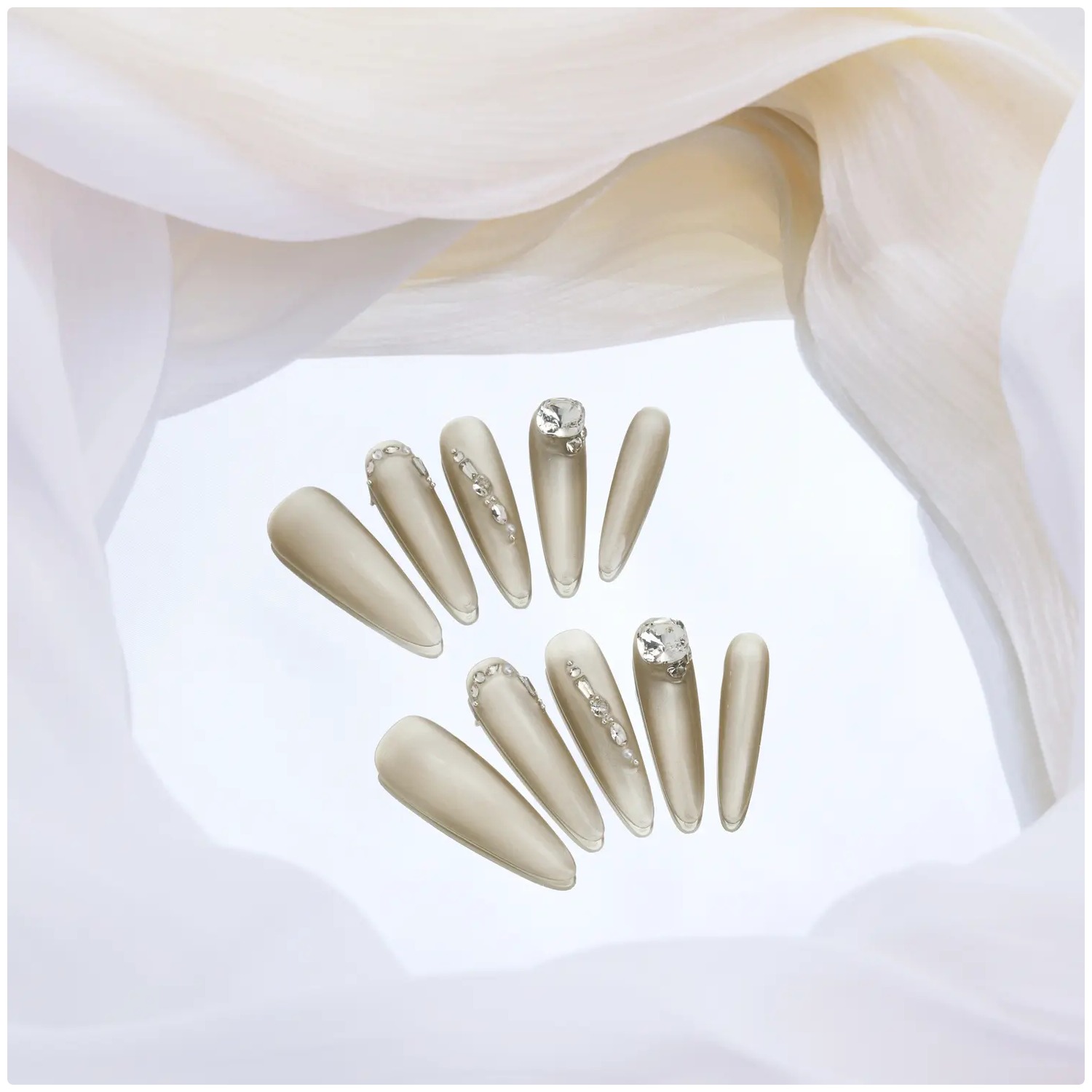 Diseño elegante en tono champagne con pedrería sutil que aporta sofisticación y brillo discreto.