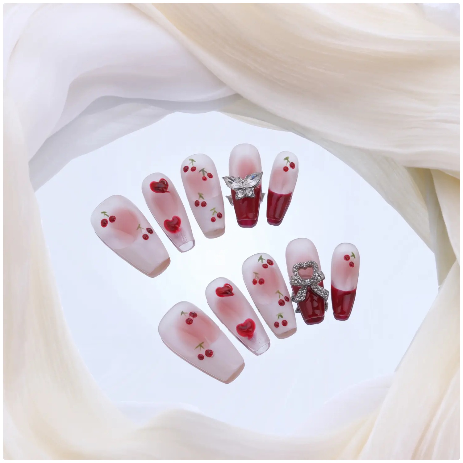 Base nude con cerezas y corazones rojos, un diseño fresco, coqueto y divertido.