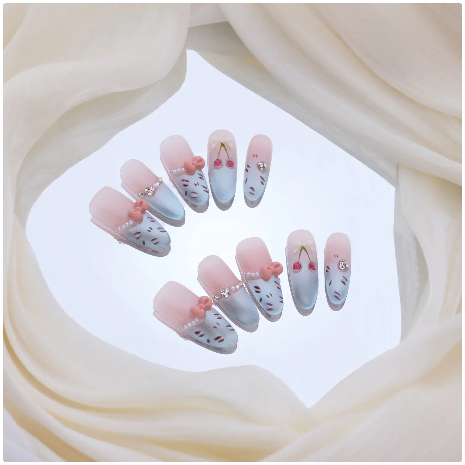 Rosa y azul con cerezas y moños 3D, alegre, juvenil y encantador.