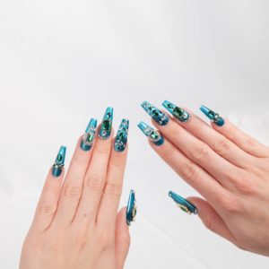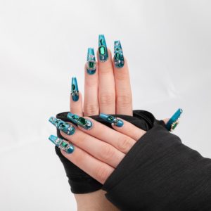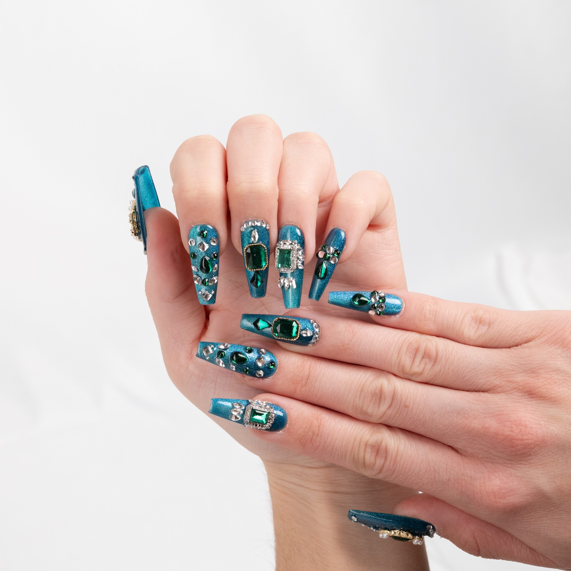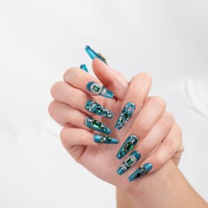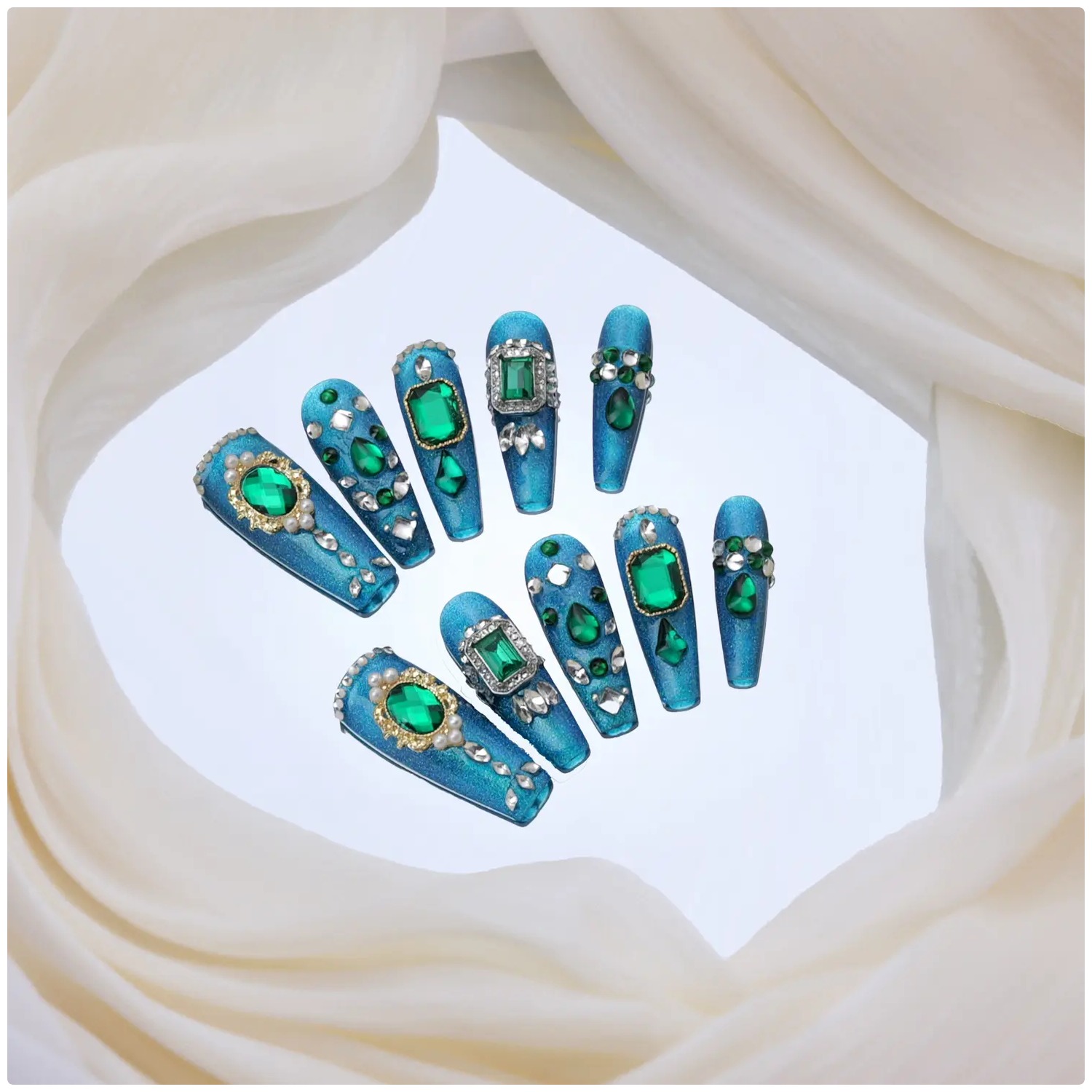 Base azul metálica adornada con piedras verdes estilo esmeralda para un look glamuroso y llamativo.