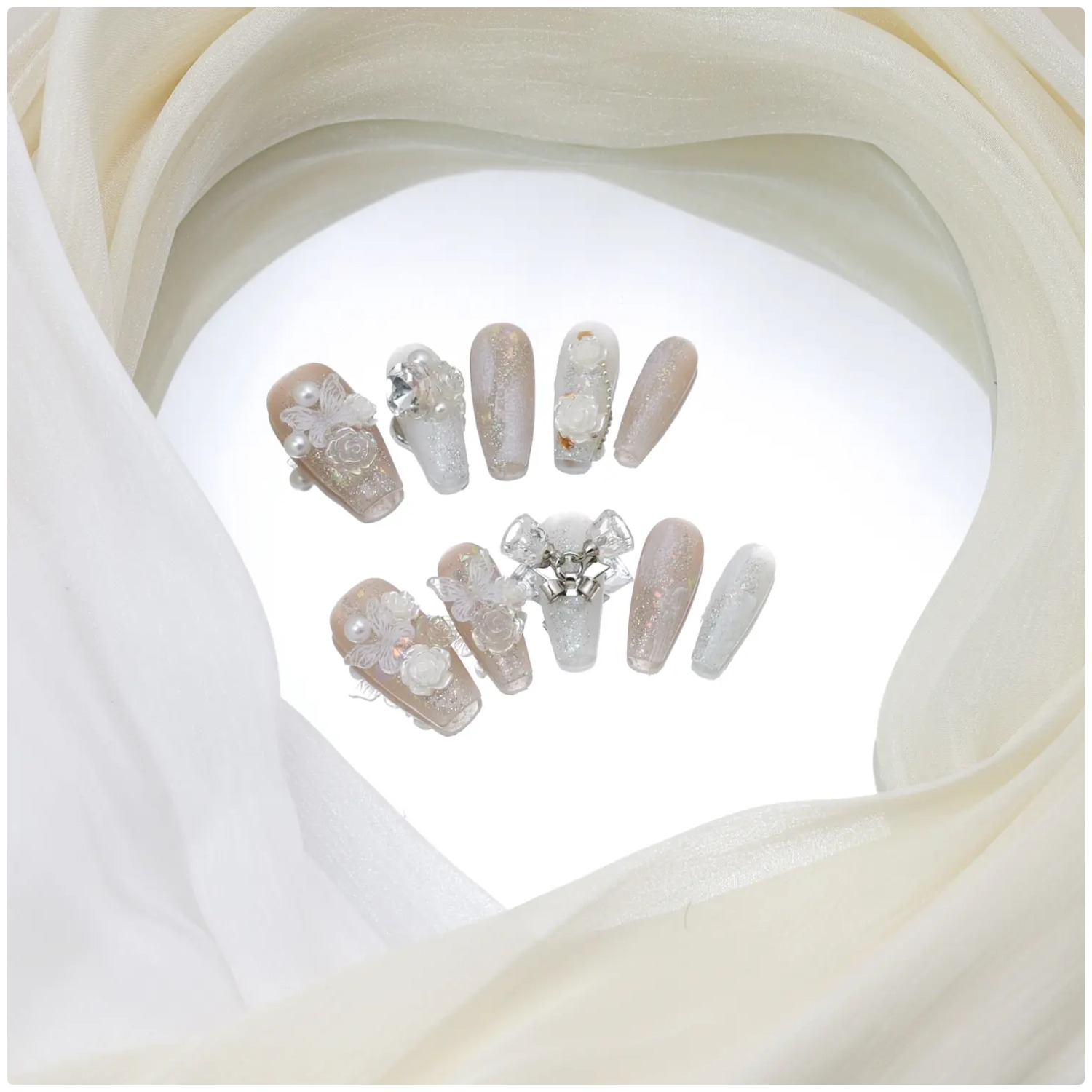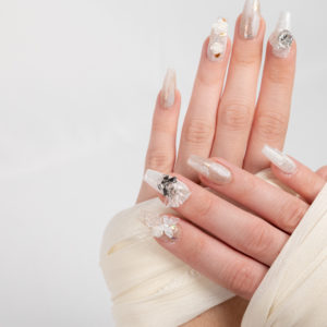 Estilo romántico con flores en 3D, perlas y brillo iridiscente que crea un acabado delicado y etéreo.