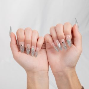 Uñas en blanco perlado con mariposas, perlas y pequeños brillos, elegantes y delicadas como un hada.
