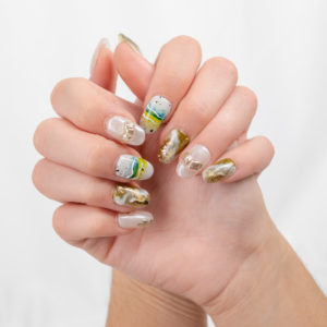 Inspirado en la naturaleza, combina tonos verdes, azules y dorados con efecto marmolado para un estilo fresco y elegante.
