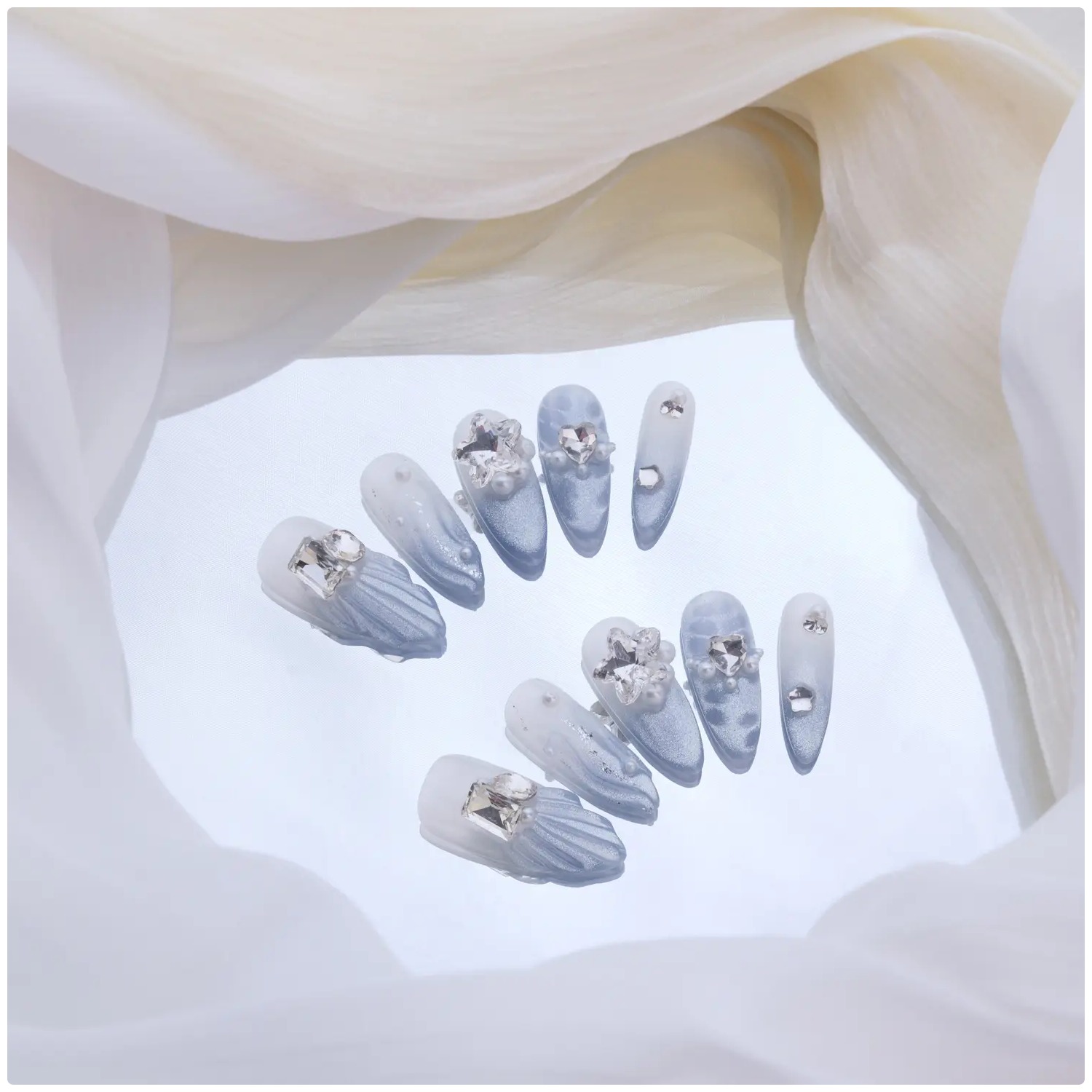 Azul hielo con brillos plateados y gemas, inspirado en la pureza del invierno.