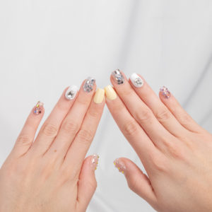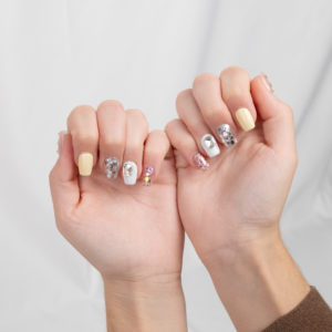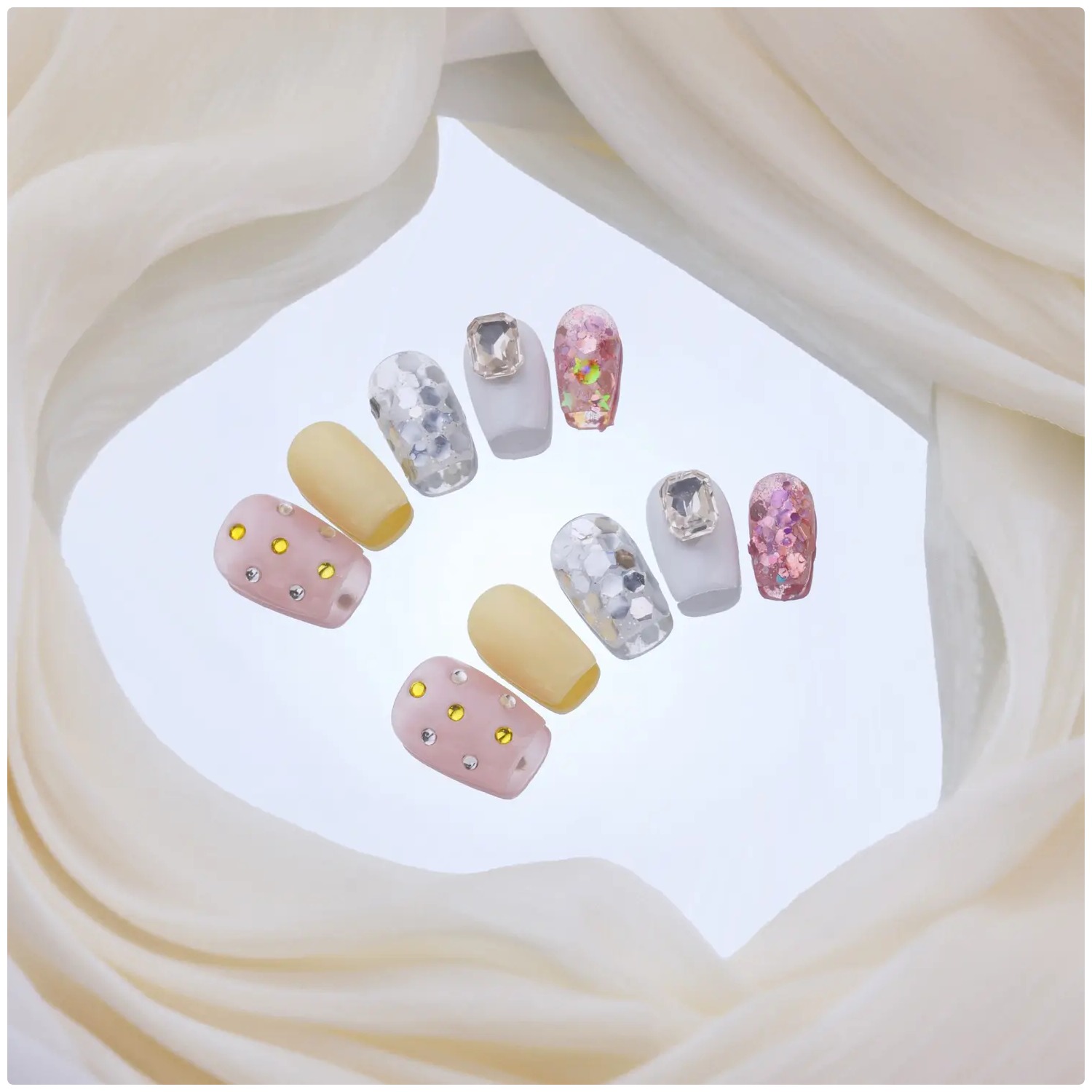 Amarillo y rosa con brillos hexagonales y gemas, inspirado en la alegría de una fiesta.