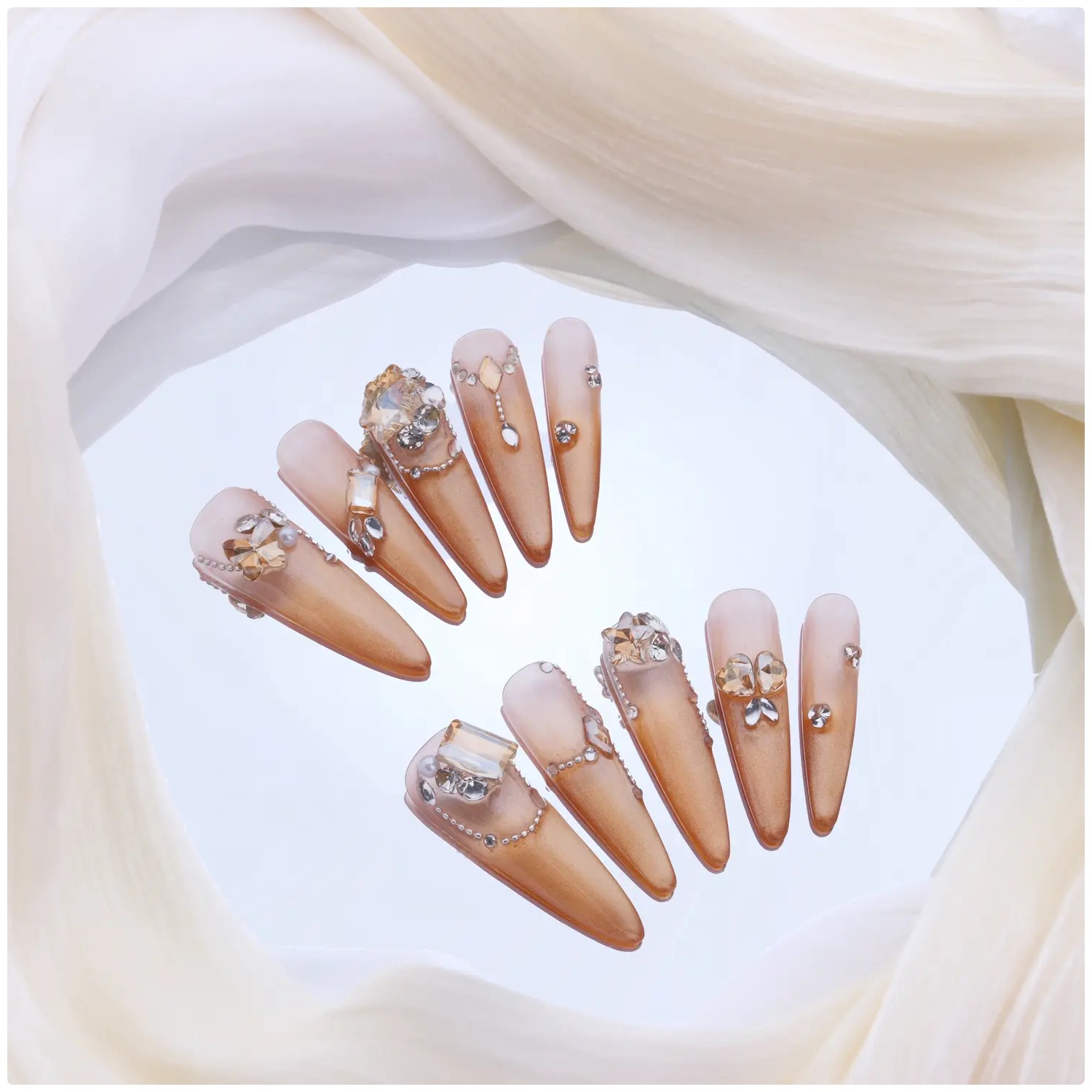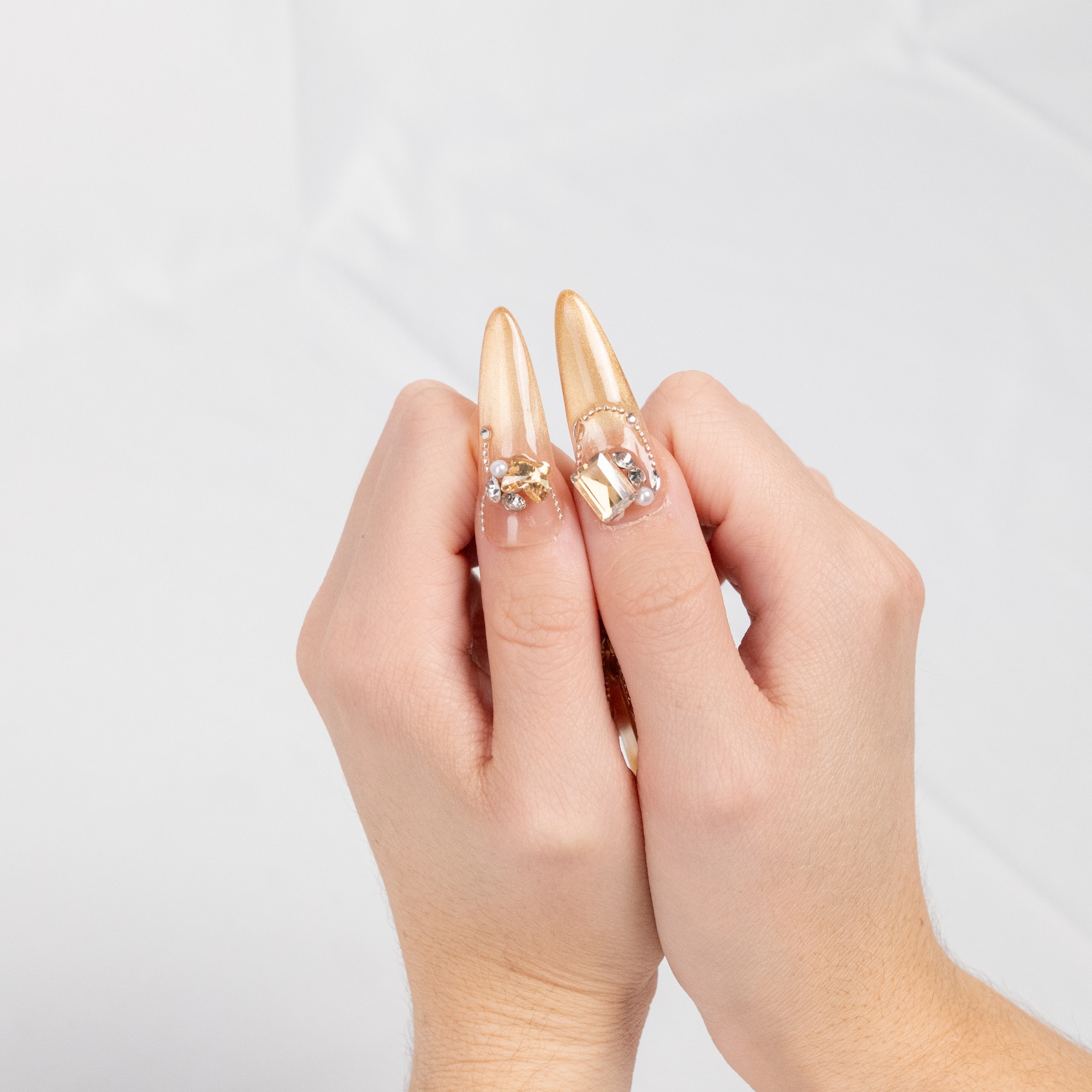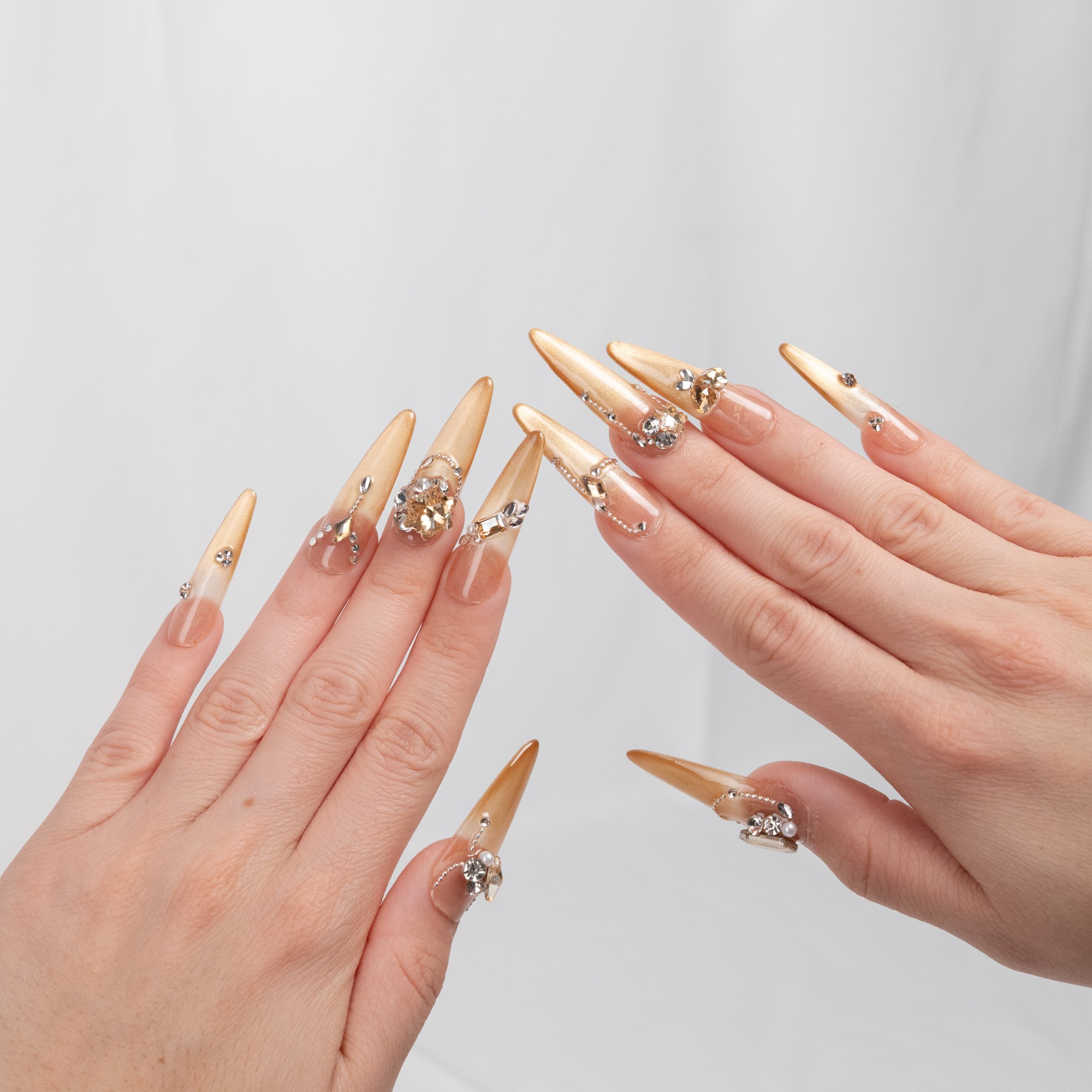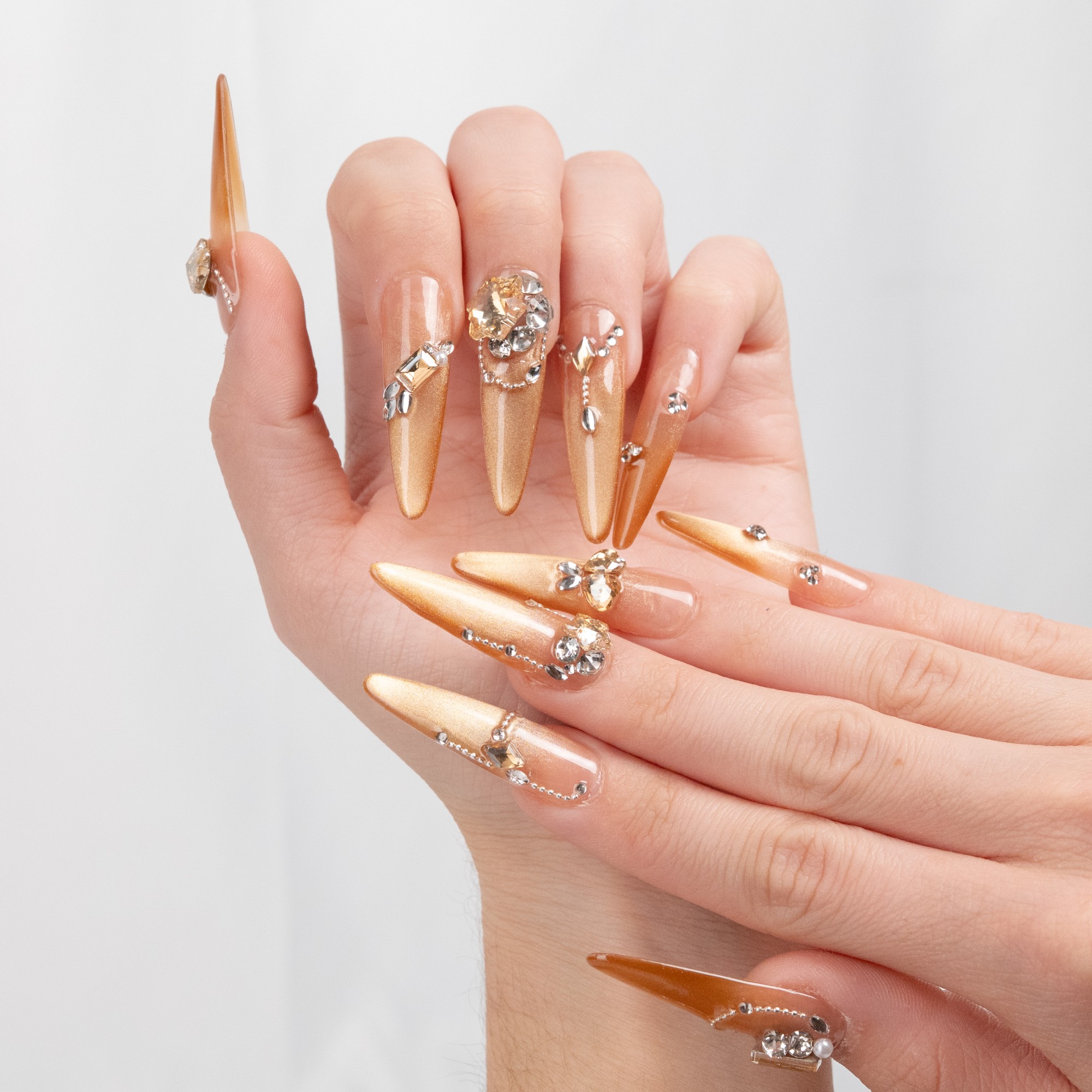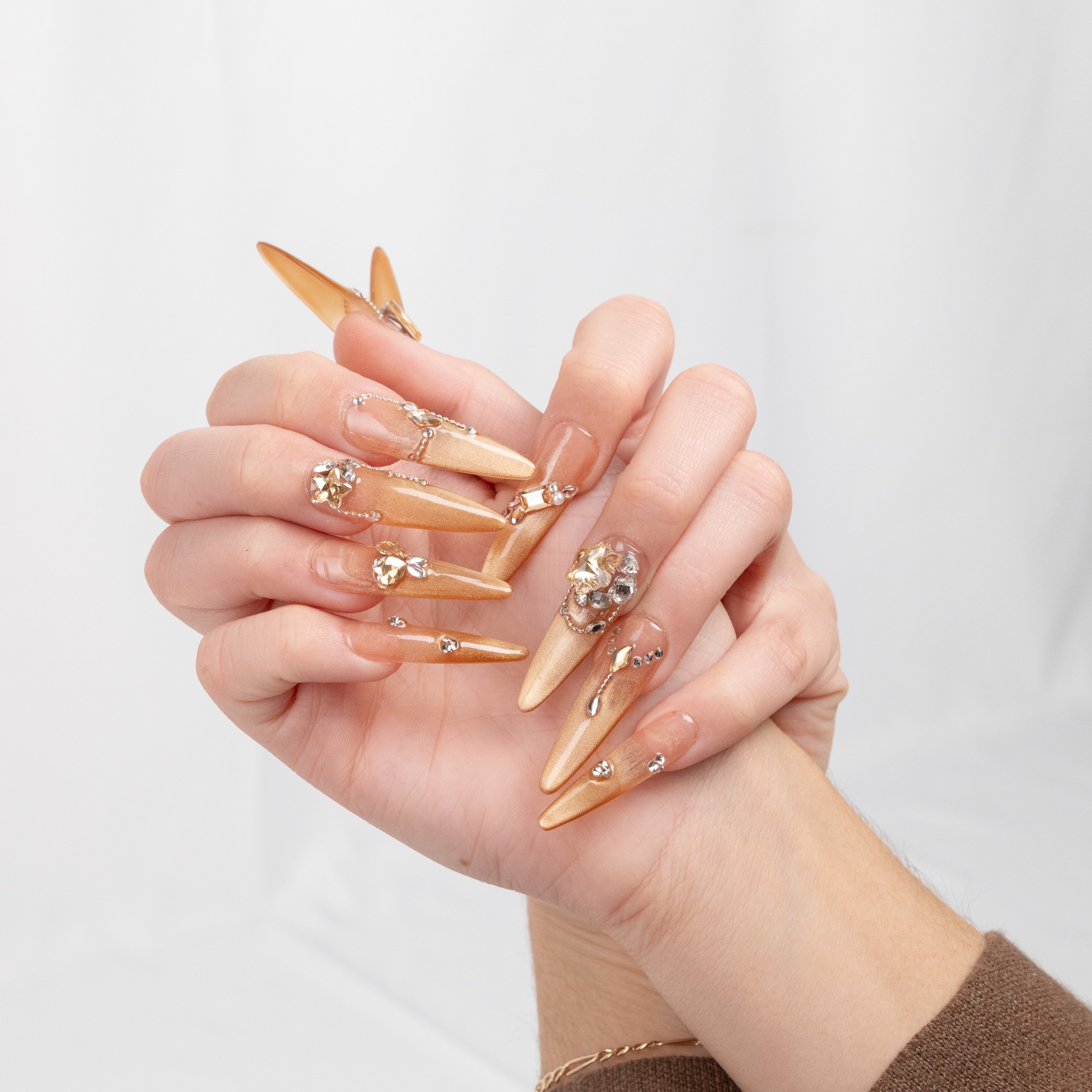 Degradado en tonos dorados y nude con incrustaciones brillantes, inspirado en la calidez de una puesta de sol.