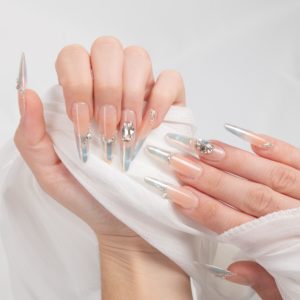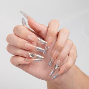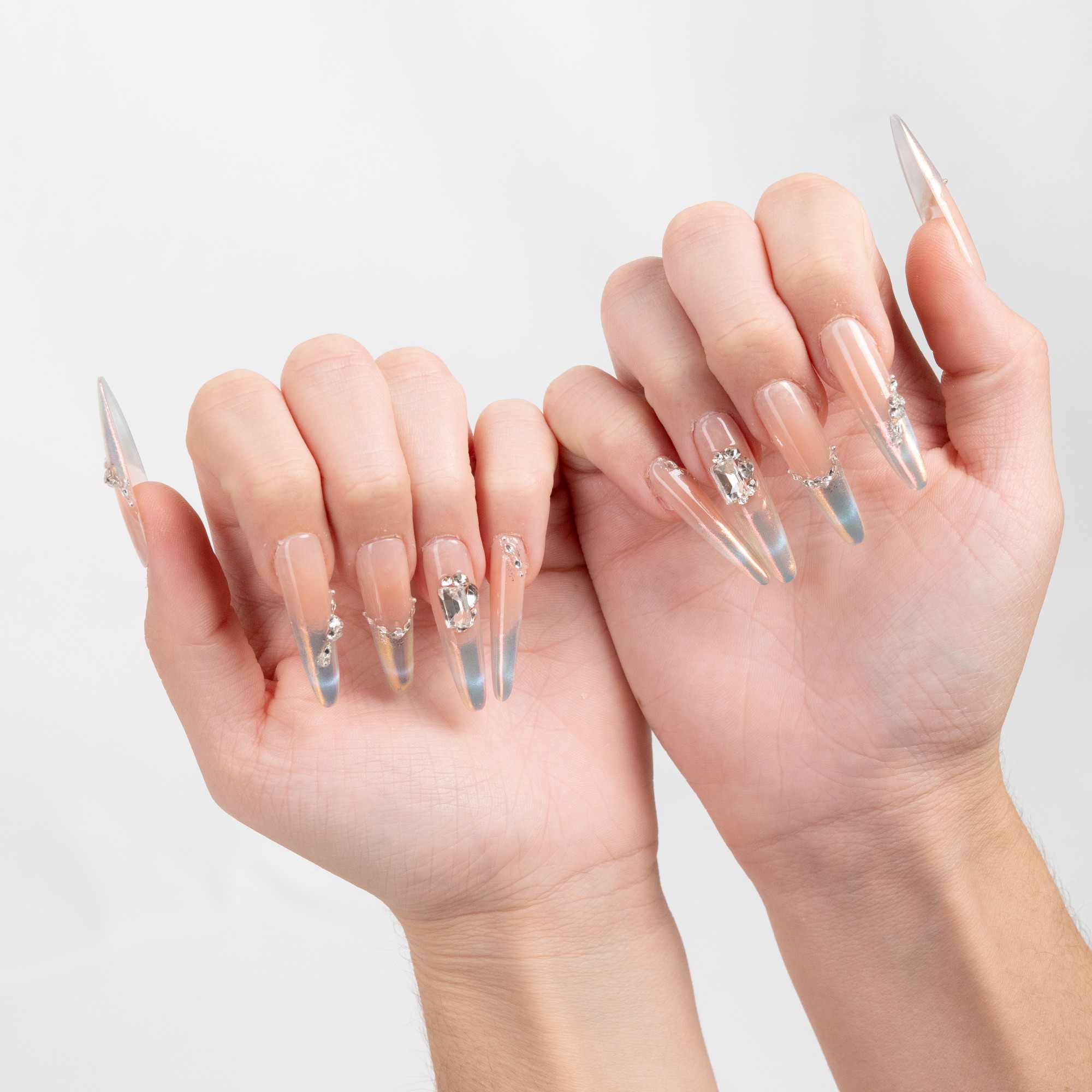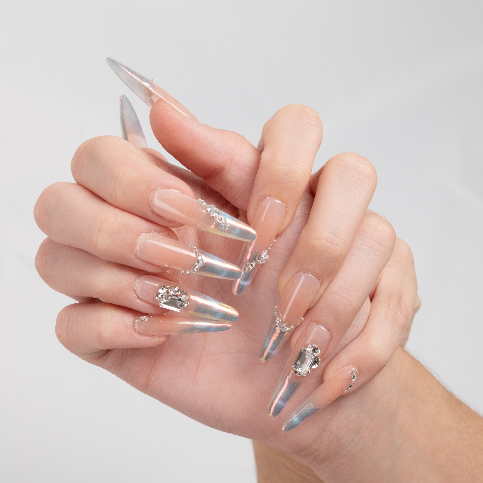 Base rosa con efecto holográfico y delicada pedrería que ofrece un brillo multidimensional y glamuroso.