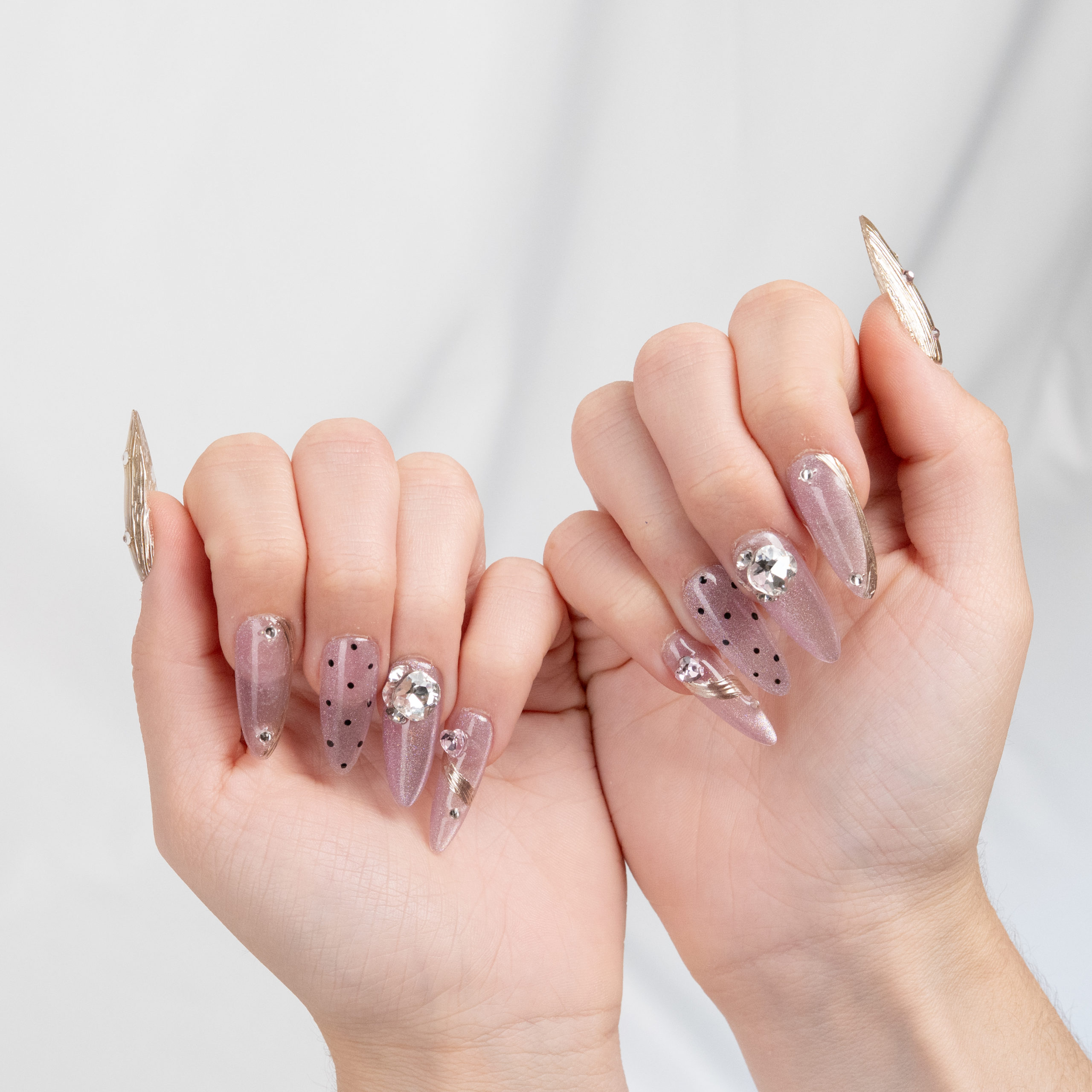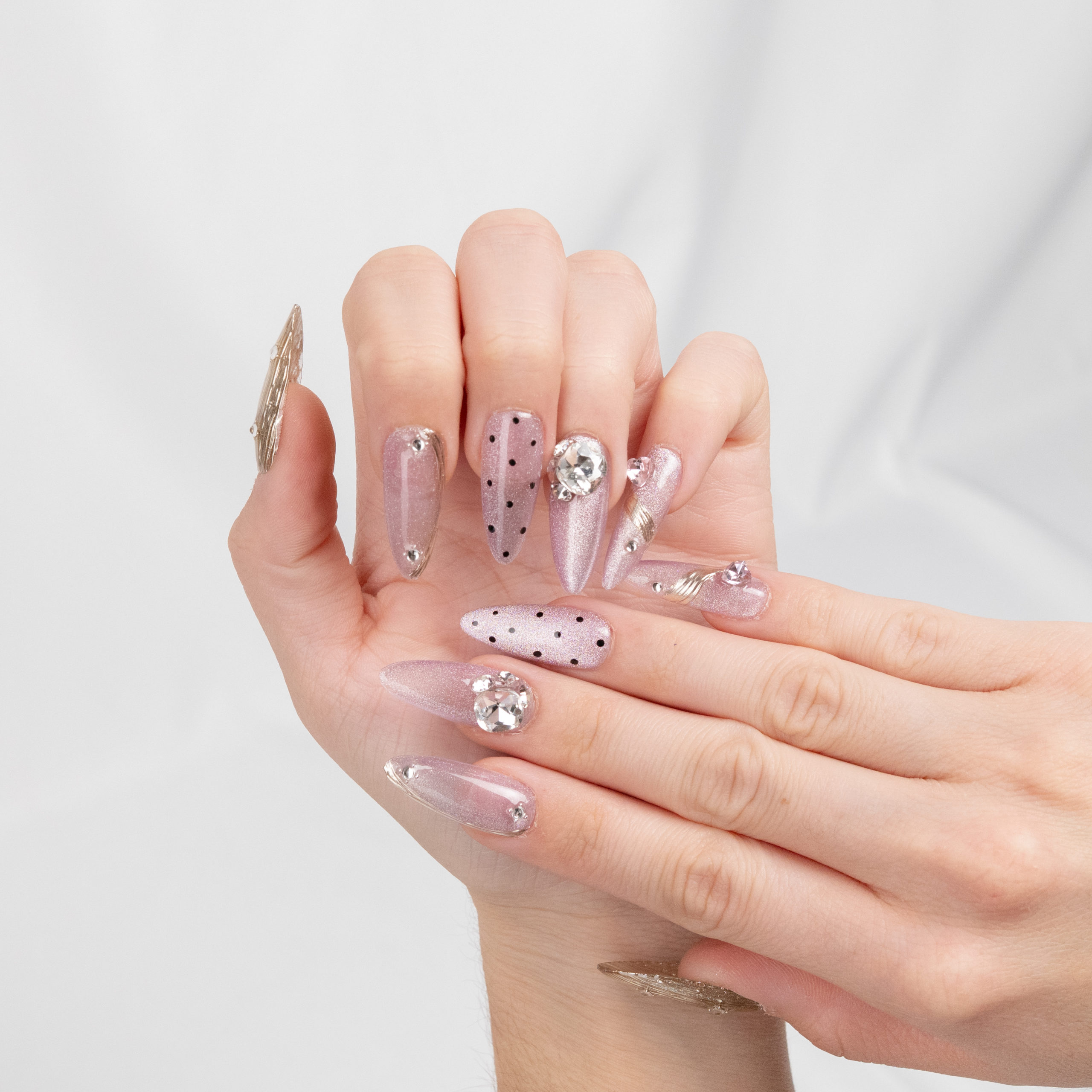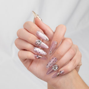 Uñas lilas con puntos negros, detalles metálicos y gemas, un estilo moderno y delicado a la vez.