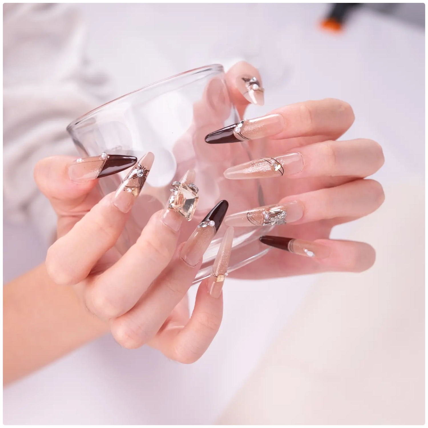 Tonos marrones degradados con grandes piedras y detalles en perlas, evocando un estilo cálido y refinado.