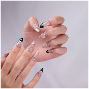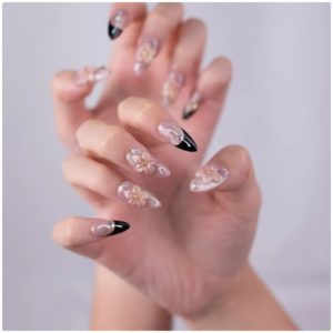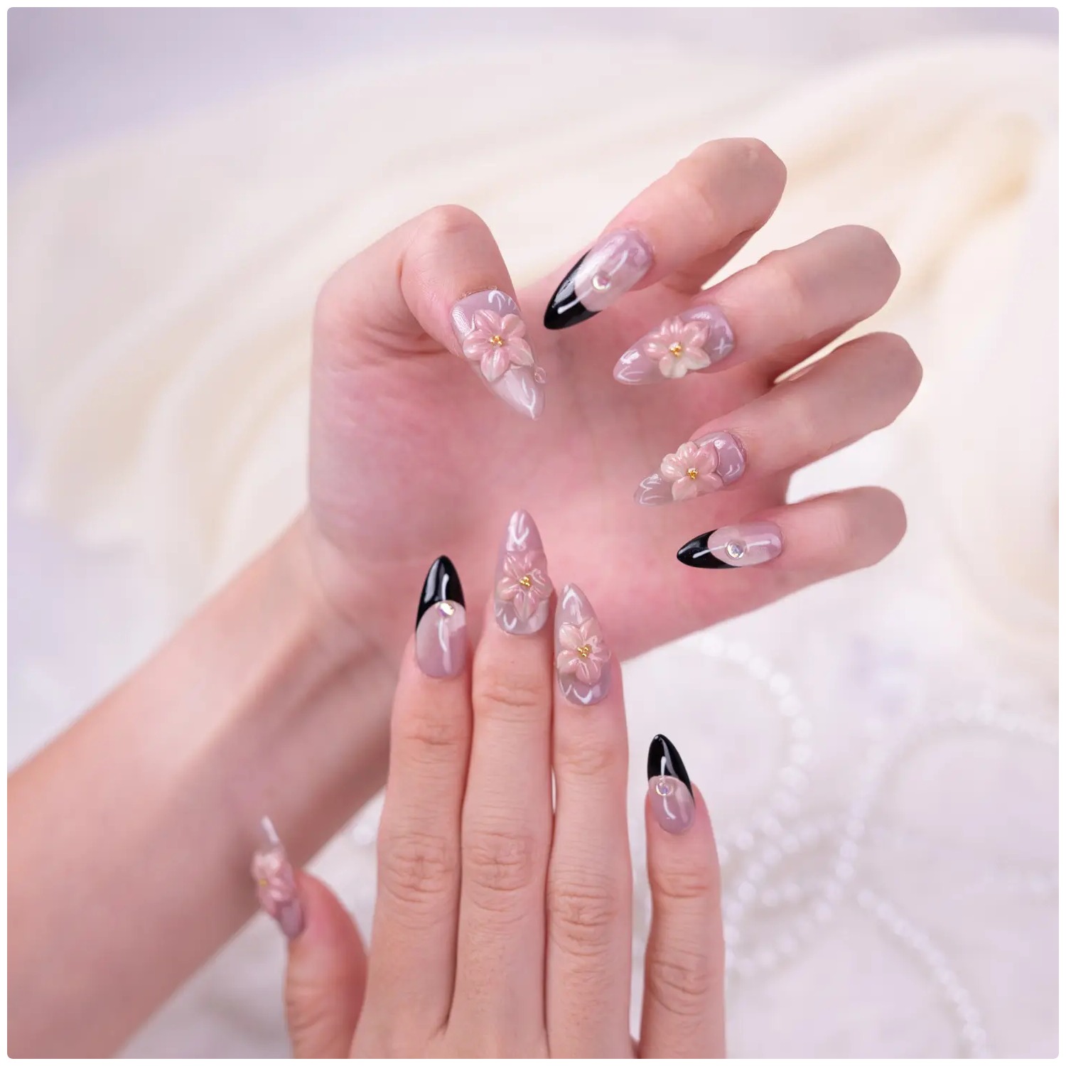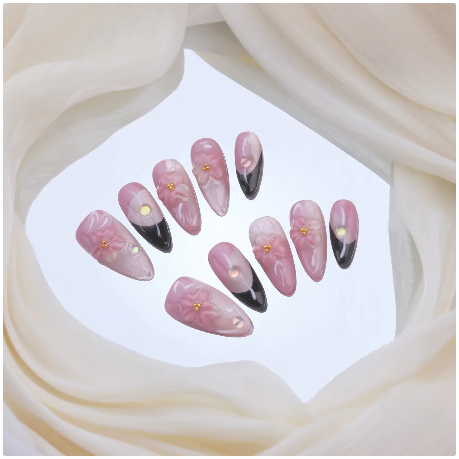 Rosa perlado con flores grandes en relieve y detalles negros, un diseño artístico y elegante.