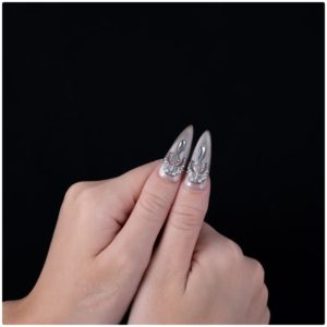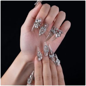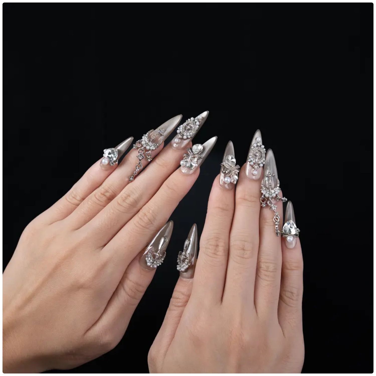 Nude con grandes cristales, perlas y detalles en plateado, un estilo lujoso y sofisticado.