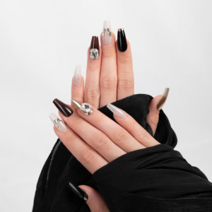 Combinación sofisticada de negro, dorado y nude adornada con cristales grandes para un look moderno y de lujo.