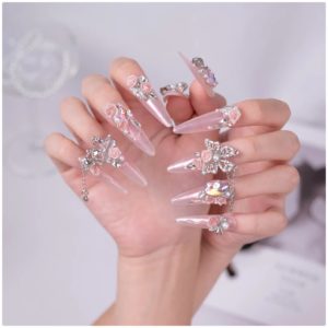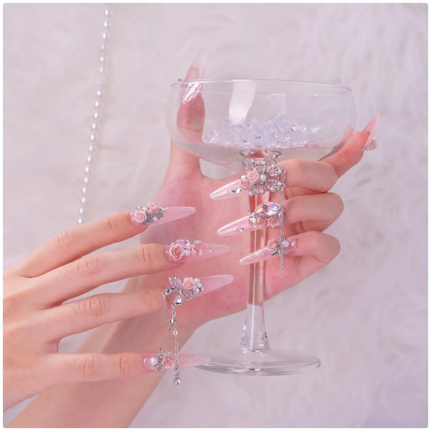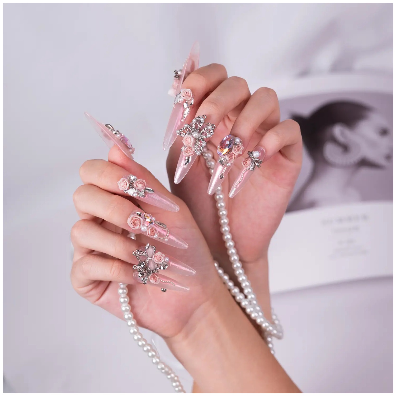 Rosa degradado con flores en relieve, cadenas y charms brillantes, un diseño majestuoso y romántico.