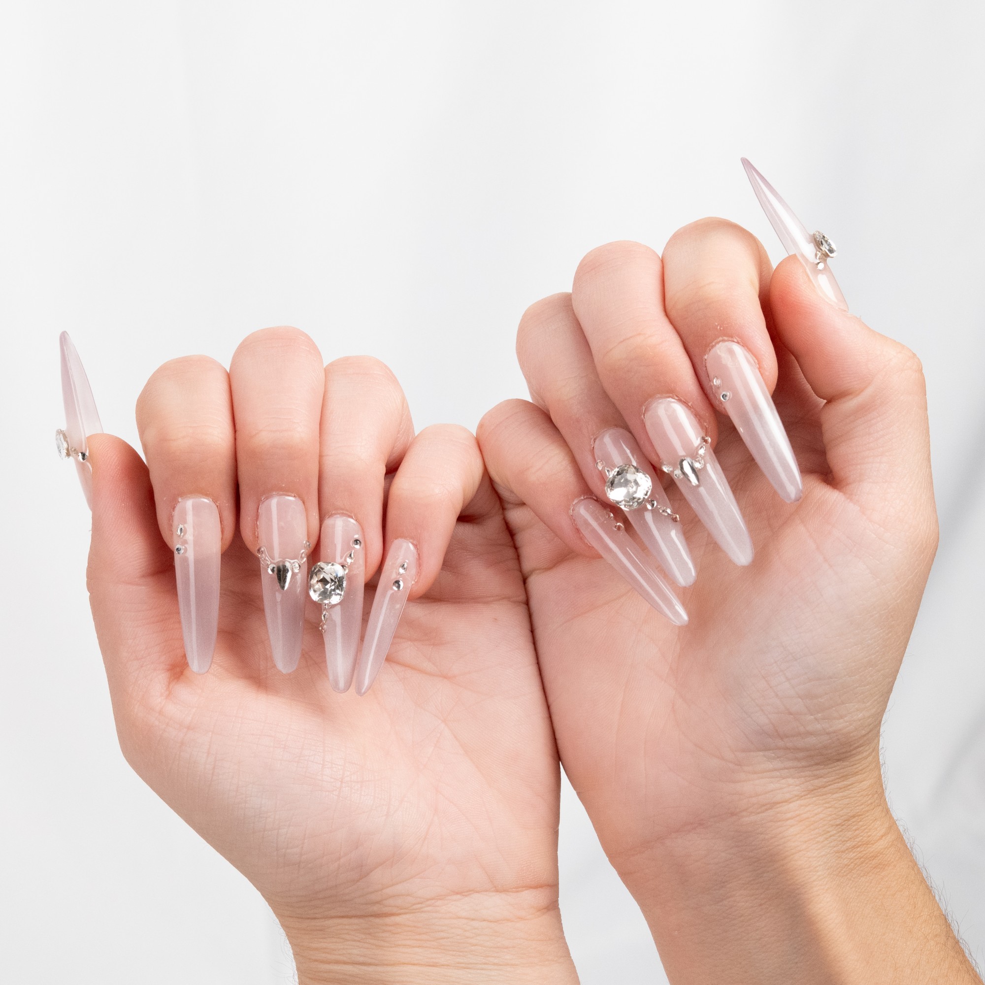 Lilas suaves con pedrería plateada, un diseño delicado y femenino que transmite serenidad y elegancia.