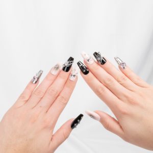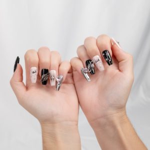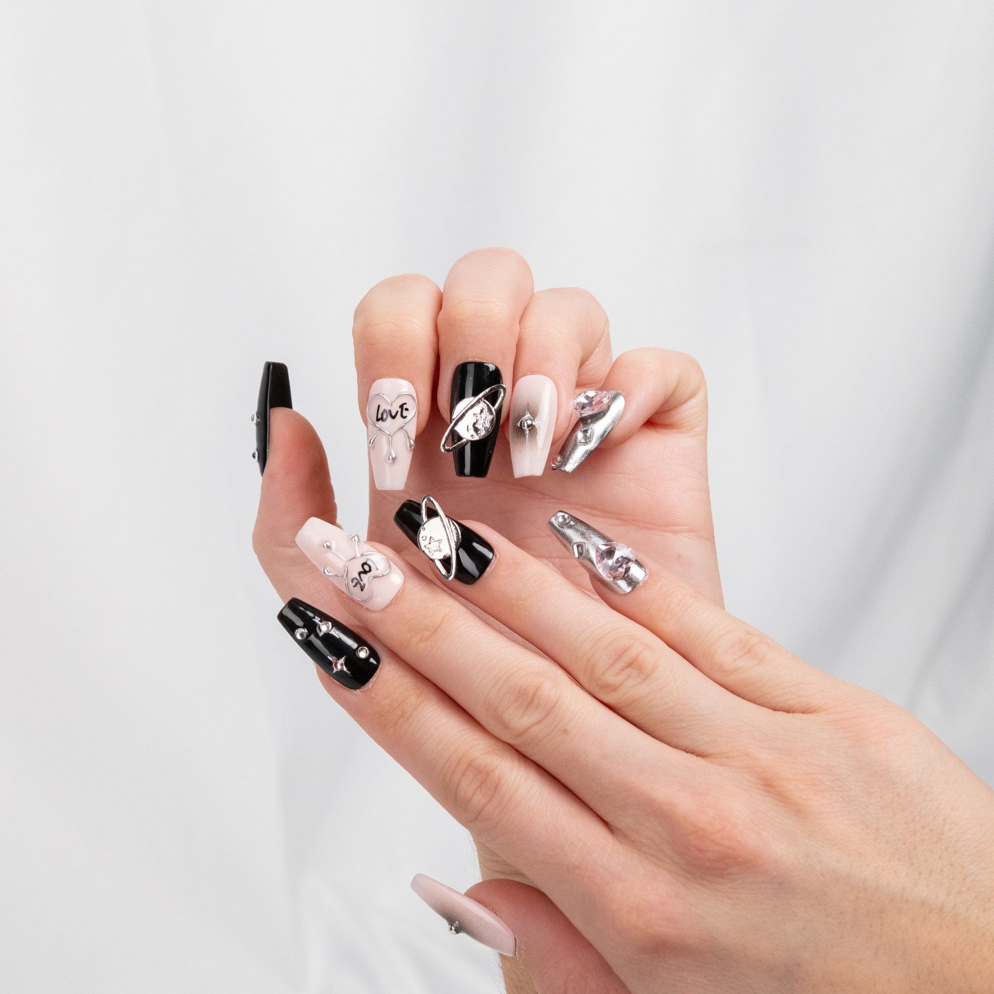 Negro y rosa con estrellas, planetas y corazones metálicos, un estilo galáctico y romántico.