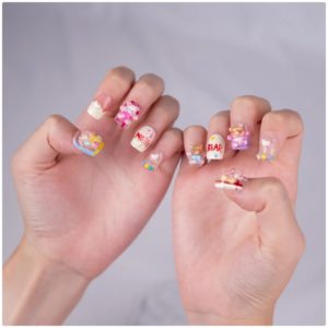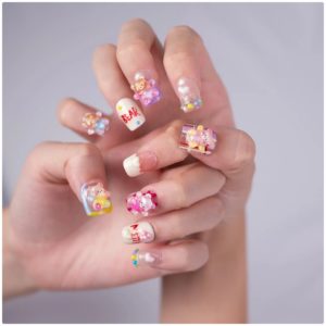 Uñas coloridas con ositos 3D, corazones y detalles divertidos, perfectas para un look alegre y tierno.