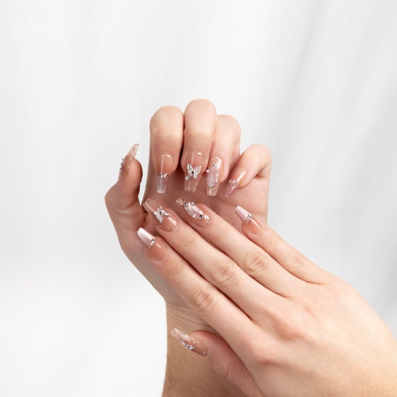 Uñas en tonos rosa con delicadas mariposas y brillos, ideales para un look romántico y femenino.