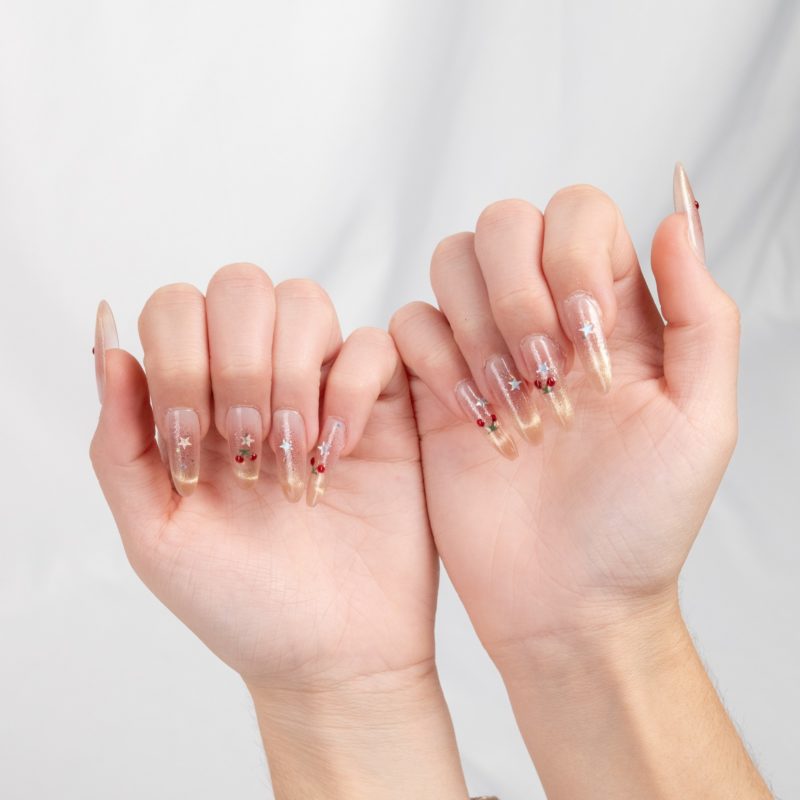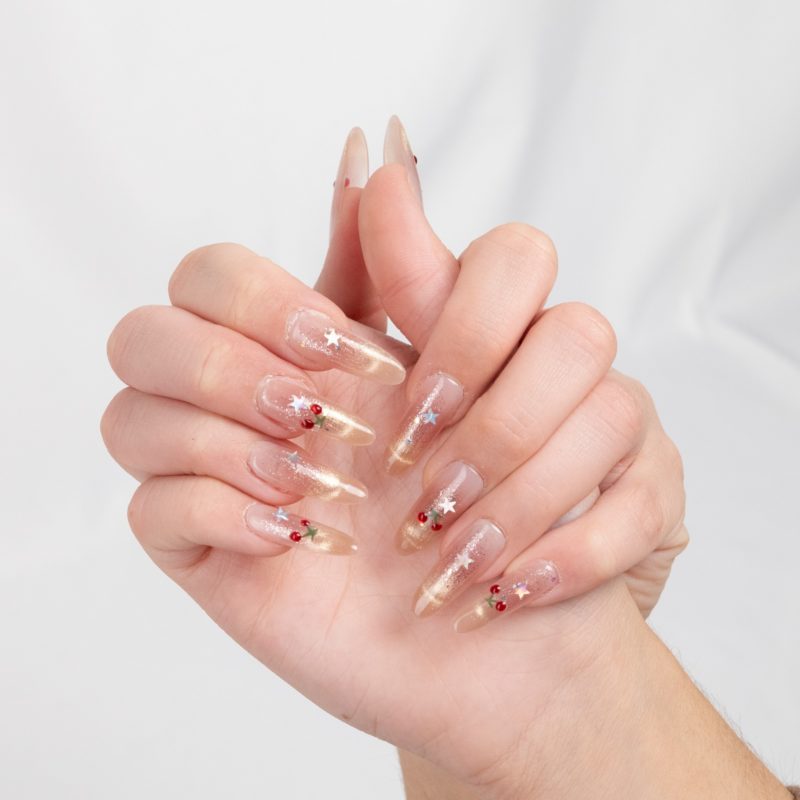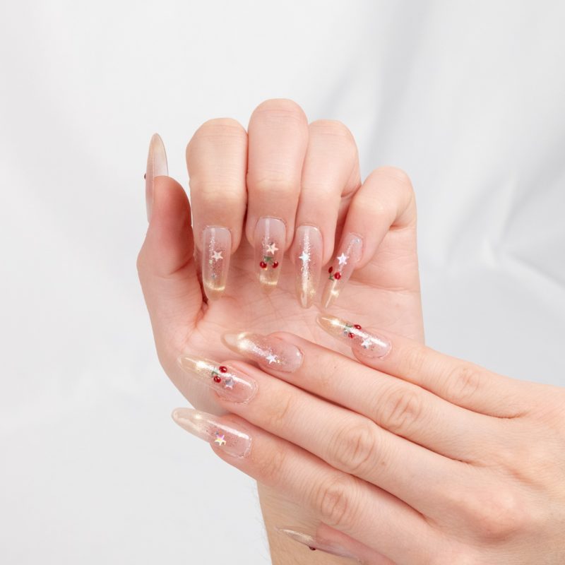 Nude con cerezas y estrellas brillantes, un look divertido con un toque mágico.