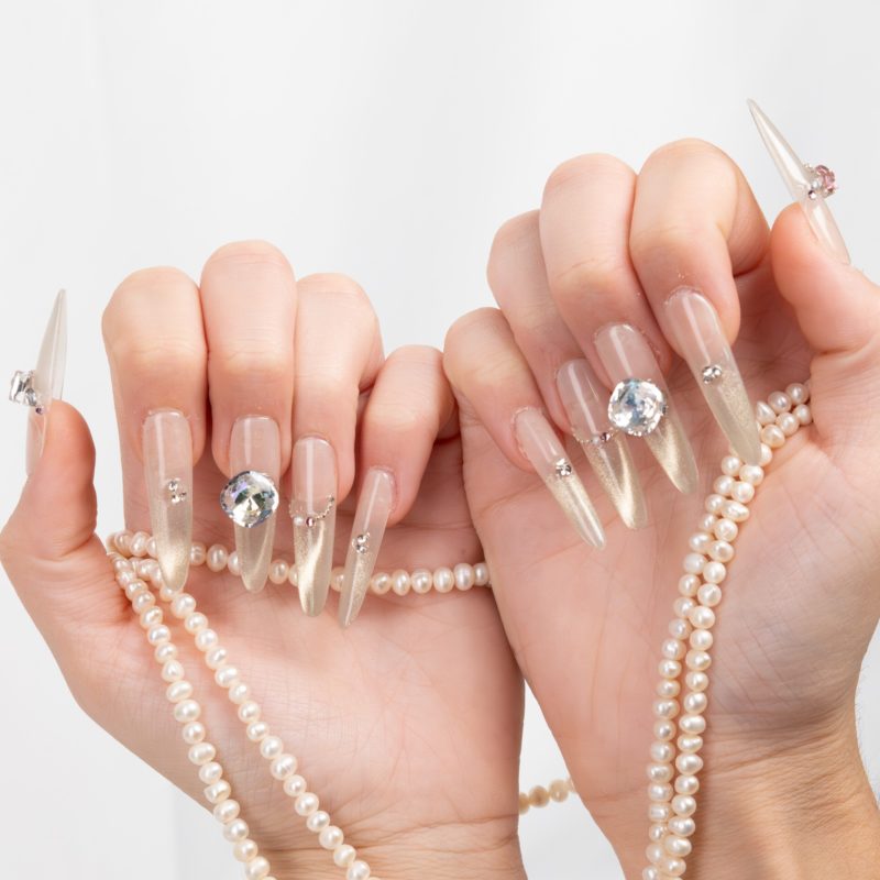 Base blanca perlada con gemas grandes y toques rosados, ideal para un look minimalista pero deslumbrante.
