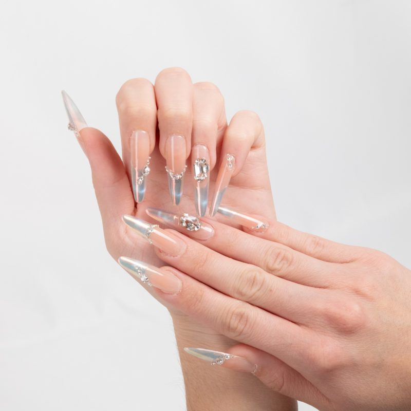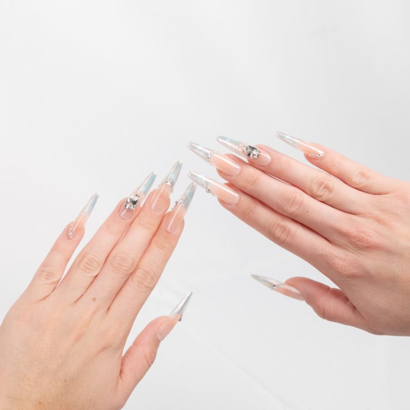 Base rosa con efecto holográfico y delicada pedrería que ofrece un brillo multidimensional y glamuroso.